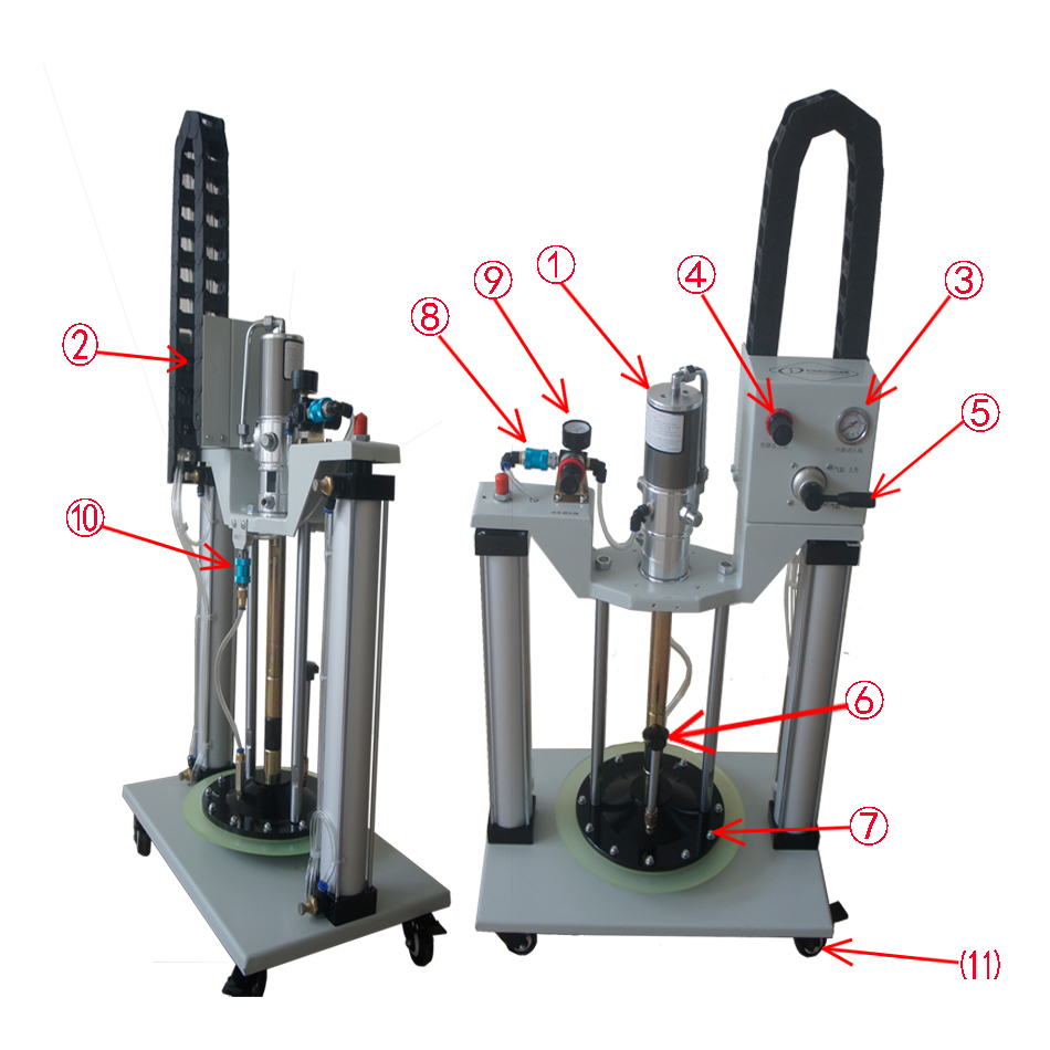 ⑩ 油桶進氣口滑動開關(當油桶吸完時把氣缸上升至高點后左手扶住油桶右手滑動開關油桶和壓油盤就分開了)