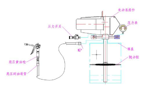 電動注脂機由電動機、減速機、高壓柱塞、調(diào)壓閥、注油槍、高壓軟管等部件組成。油桶使用標(biāo)準(zhǔn)潤滑脂包裝油桶,本機不附帶。